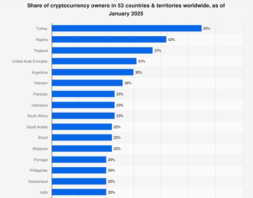 Das Muster ist eindeutig: Die Länder mit der höchsten Krypto-Adoption sind fast ausnahmslos Länder mit schwachen Währungen - Türkei (55%), Nigeria (42%), Argentinien (30%)... Die leider oft arme Bevölkerung dort verwendet nicht Bitcoin & Co., weil sie spekulieren wollen. Sie nutzen es gezwungenermaßen, weil ihre Landeswährungen versagen.