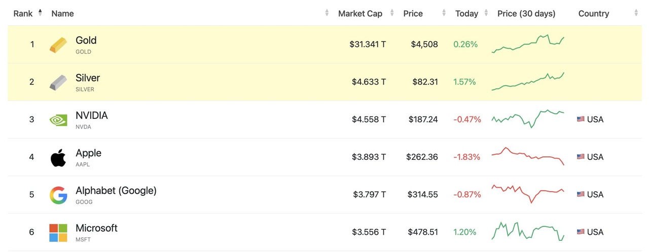 Silver has just overtaken $NVDA (+0.33%) in market capitalization, climbing to $4.63T and becoming the second-largest asset globally, behind only gold.