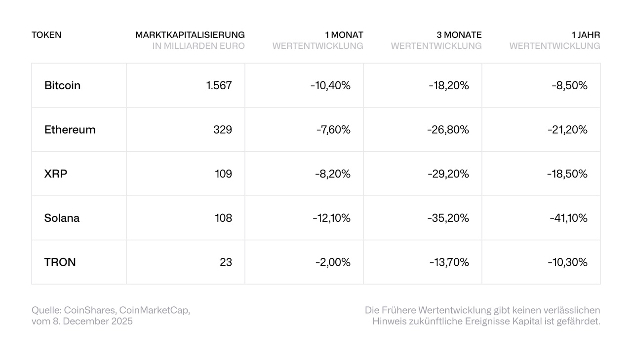The crypto markets are currently volatile and characterized by uncertainty: Bitcoin saw outflows of USD 946 million last week, while Ethereum saw inflows of USD 205 million, supported by a 2x leveraged ETP with USD 457 million. Despite the difficult market conditions - including the liquidity cascade on October 10 and weaknesses at US regional banks - interest in digital assets remains high, particularly in Ethereum and new ETP products. Investors thus continue to show conviction in selected digital assets.