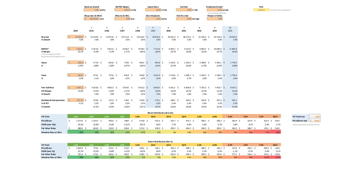 If we now estimate the future sales growth, the future EBITDA margin, the future expenses for capex, taxes and stock-based compensation, we can estimate the future free cash flow. If we can then estimate the FCF yield with which a share can be sold in X years, we can estimate the future market capitalization of the company. If we also take into account the number of outstanding shares and any share buybacks by the company, we can also estimate the price per share in X years.