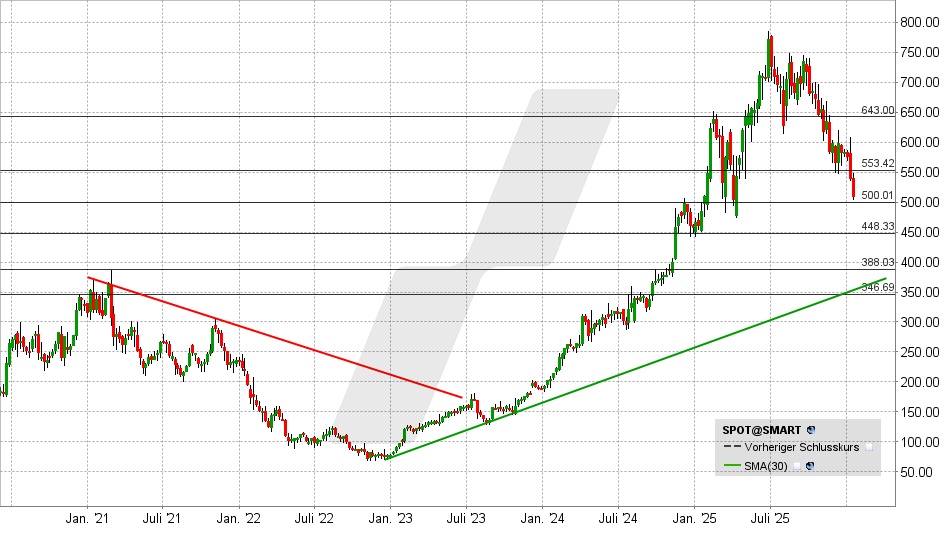 Spotify has returned to the important support level of USD 500. It will now be exciting here. If a bottom is formed, this could enable a recovery towards USD 550.