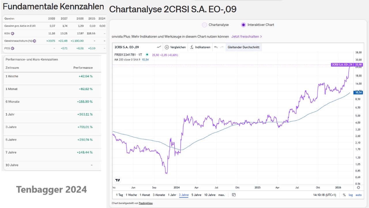After a spectacular year in 2025, the 2CRSI share is stable at the start of 2026. The share price is currently trading at EUR 15.10 - unchanged from the previous day, but with an impressive increase of almost 285% over the year. But now the question arises: how sustainable is this soaring price?