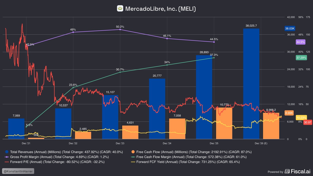 The company holds roughly 28% market share of Latin America’s online retail market, mainly driven by Brazil, Argentina and Mexico. But what makes MercadoLibre even more dominant is that management understood early on that fintech integration is key. Now Mercado Pago, its fintech arm, processes over $90 billion in total payment volume quarterly. That’s how you build an ecosystem.