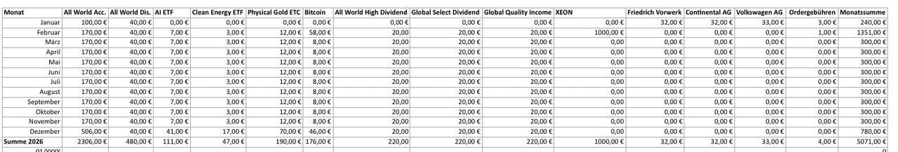 In the meantime, I came up with the idea at the end of January 2026 and added the two existing savings plans $VWCE (+1,89 %) and $VWGL additional savings plans ($AIQG (+2,87 %)