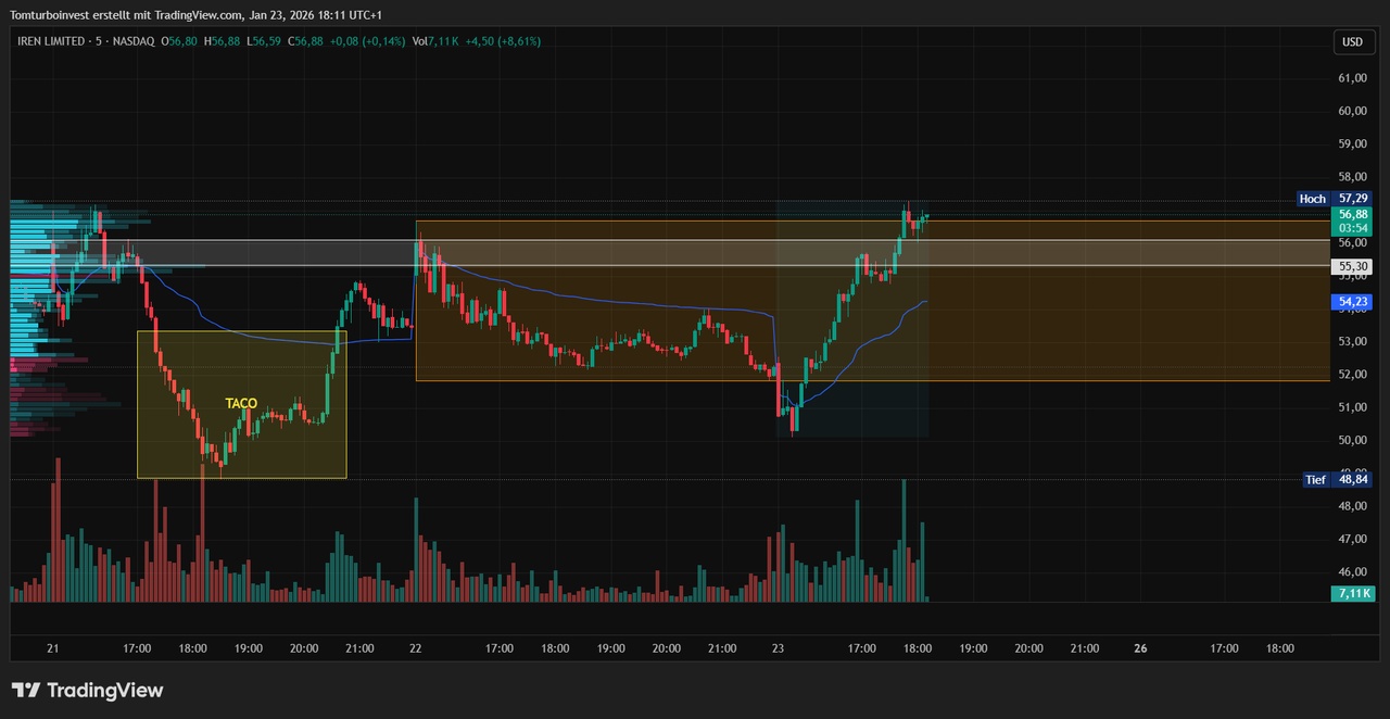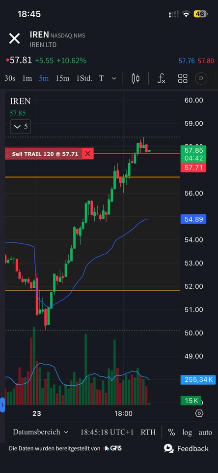 $IREN (+9,69 %) After my day trades last week, I started a swing long yesterday evening at 53.73$ / 100 shares.