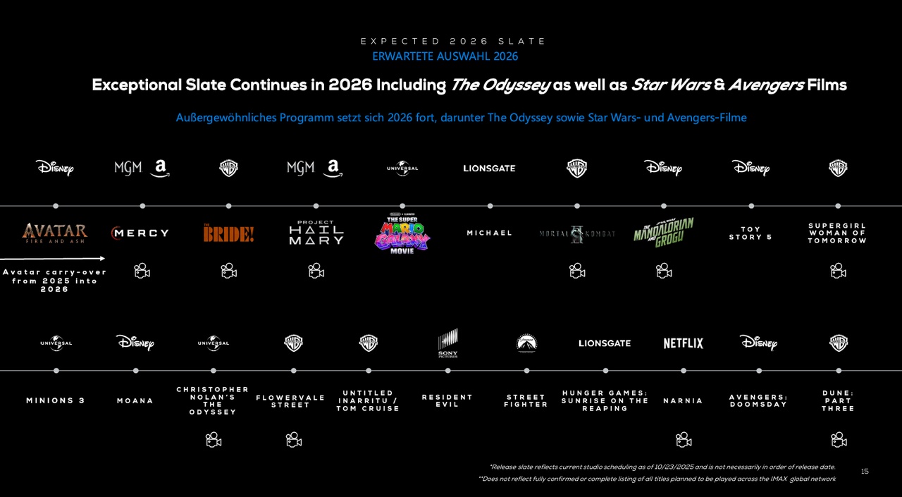 Wedbush highlighted several factors supporting the outlook for IMAX, including a projected increase in volume and quality of titles filmed for IMAX (FFI) from 2026 to 2028, which analysts said "should drive greater market share gains."