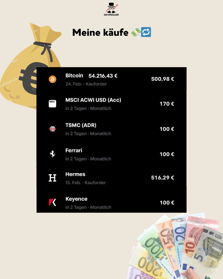 The iShares MSCI World Small Cap ($WSML (+0,42%)) gained +3.61%, while the iShares MSCI ACWI ($ACWI) formed a solid base with +0.70%. The Xtrackers II EUR Overnight Rate ($XEON (+0,01%)) rounded off the picture with +0.15% and served as a source for the Bitcoin investment.