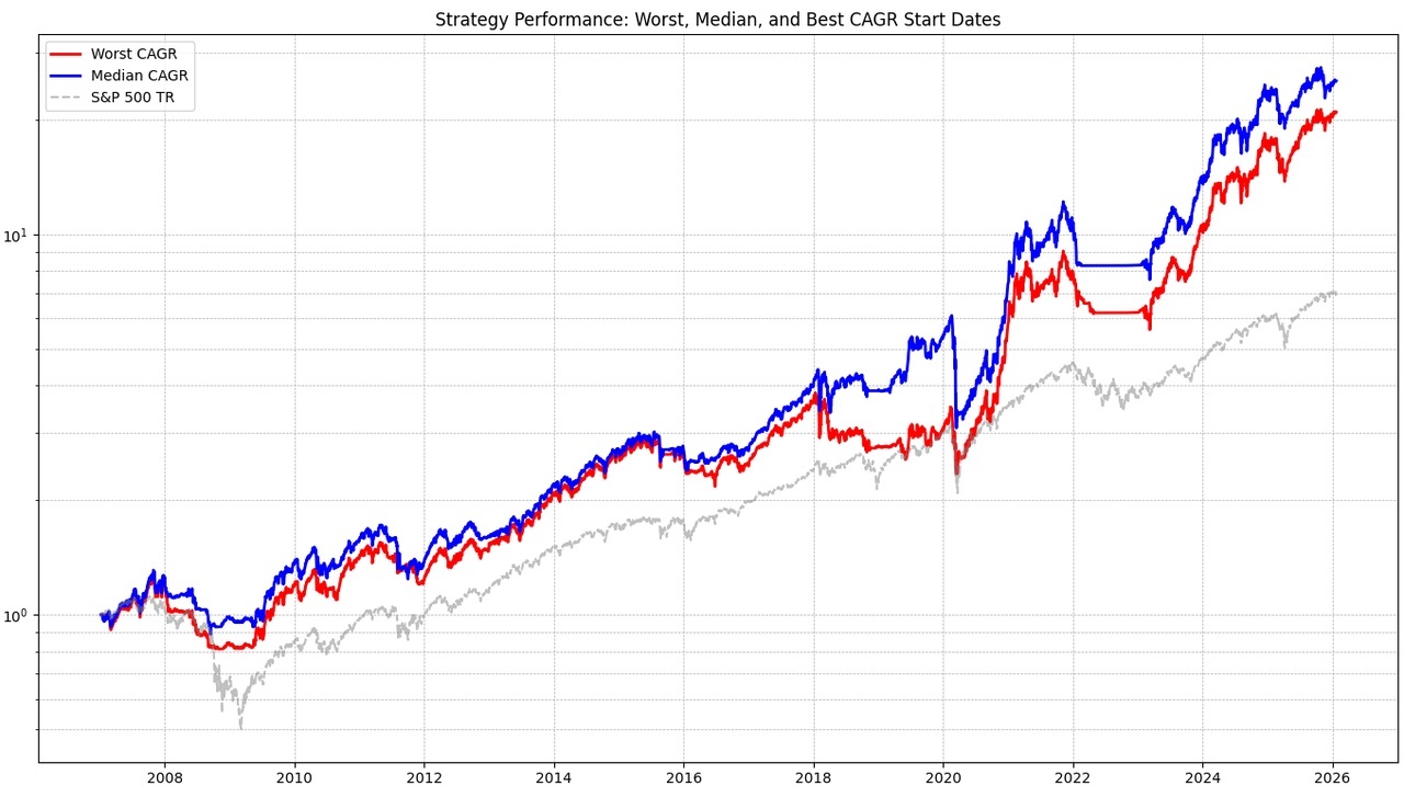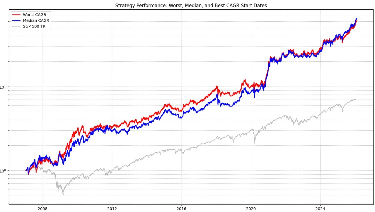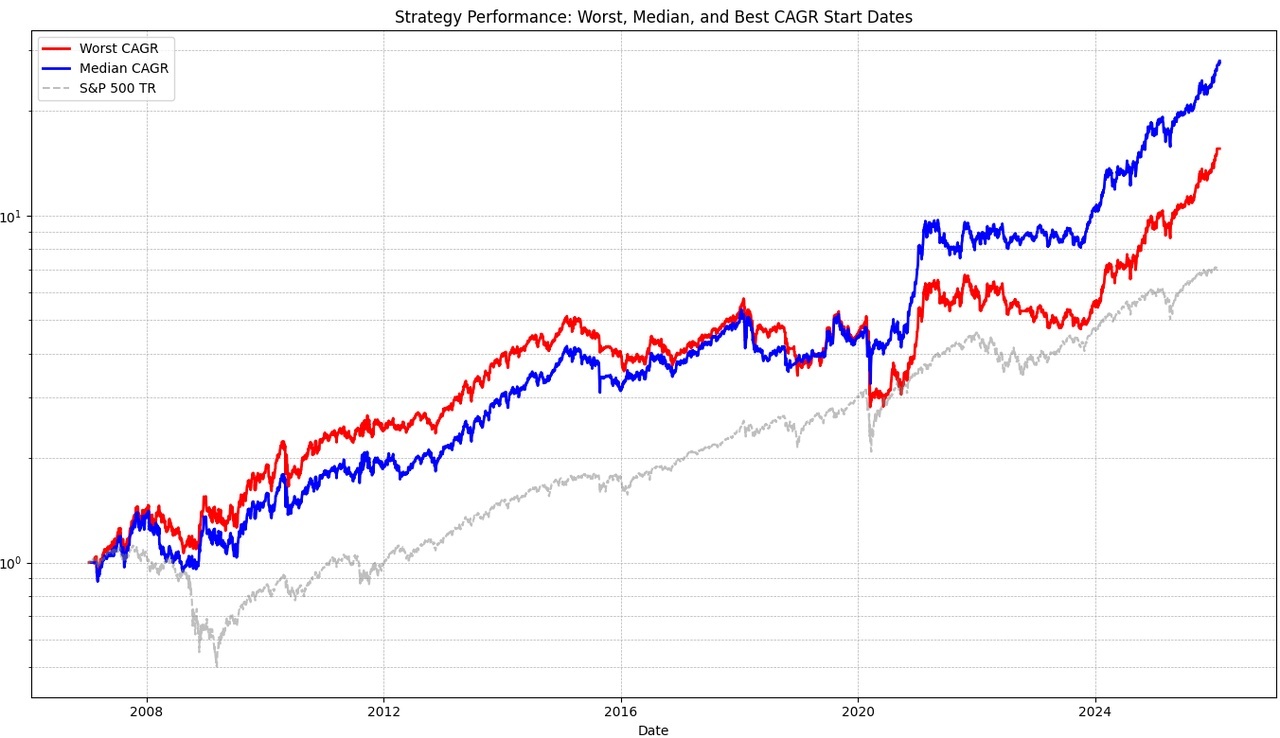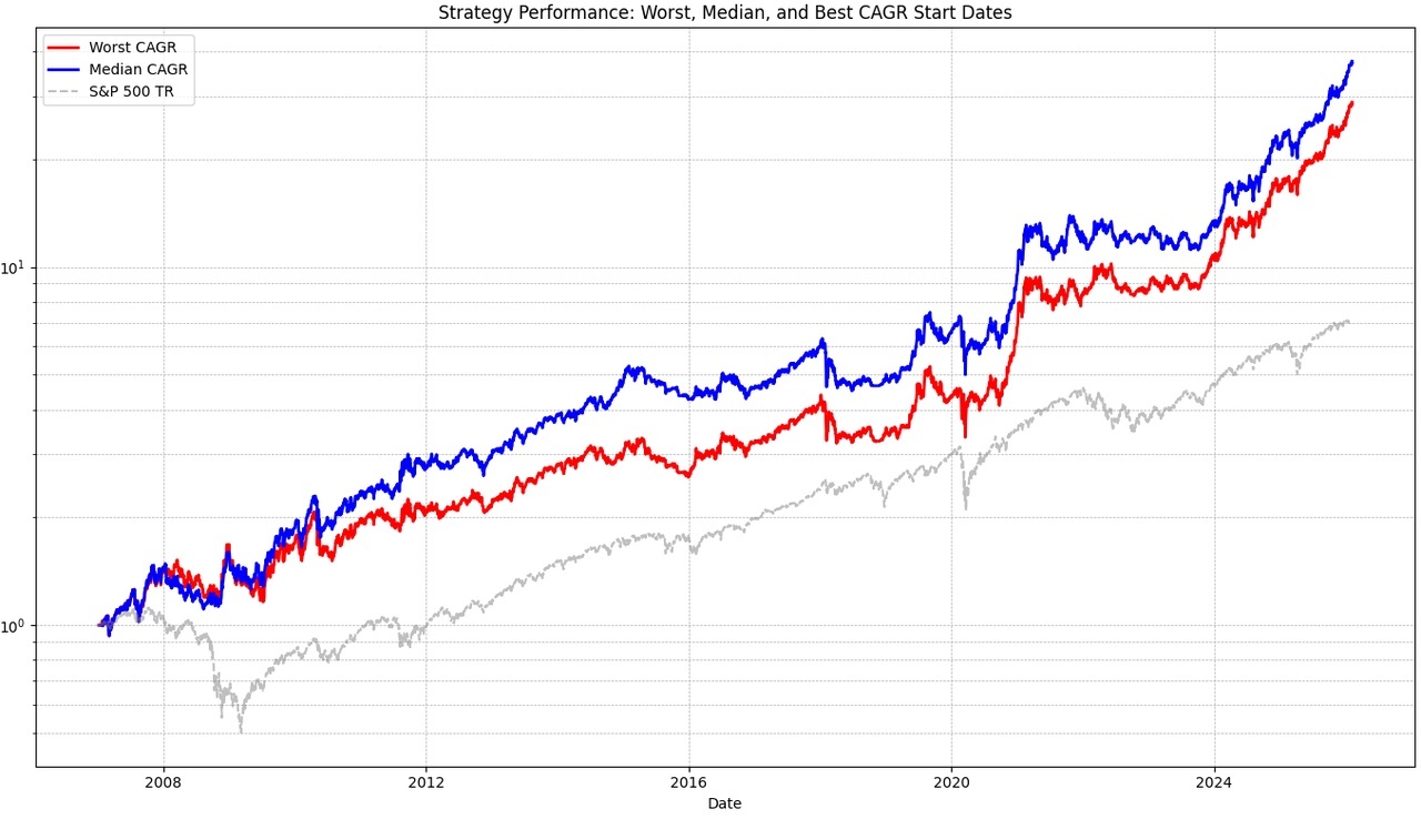 I will always show 3 graphs. The gray one is the benchmark (S&P 500 TR). I have abstracted Epi's strategy again to get a better comparison to my strategy. It is not traded at the beginning or end of the month, but a simulation for every possible trading day (e.g. the 1st, 15th, 20th, etc.) in the month. The median is shown in blue and the worst case in red. All the above metrics always refer to the worst case in order to calculate as conservatively as possible.