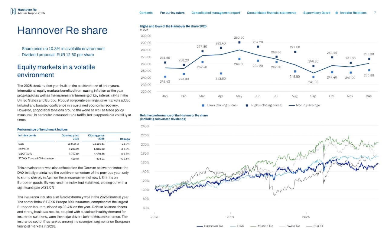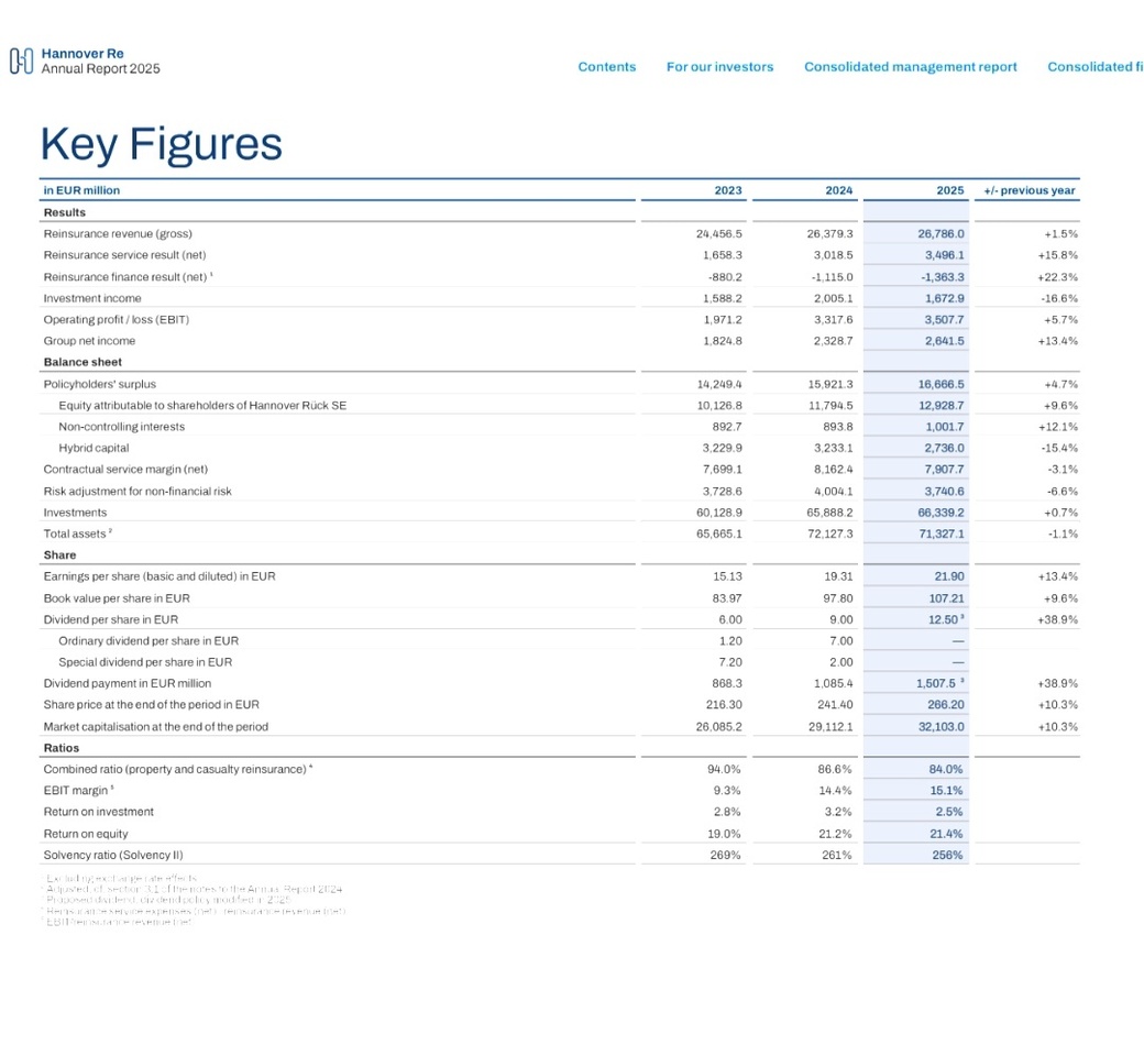 Hannover Re remains in an extremely solid financial position. The Solvency II ratio is 256%, well above the regulatory requirements. Equity continued to grow to around EUR 16.7 billion.