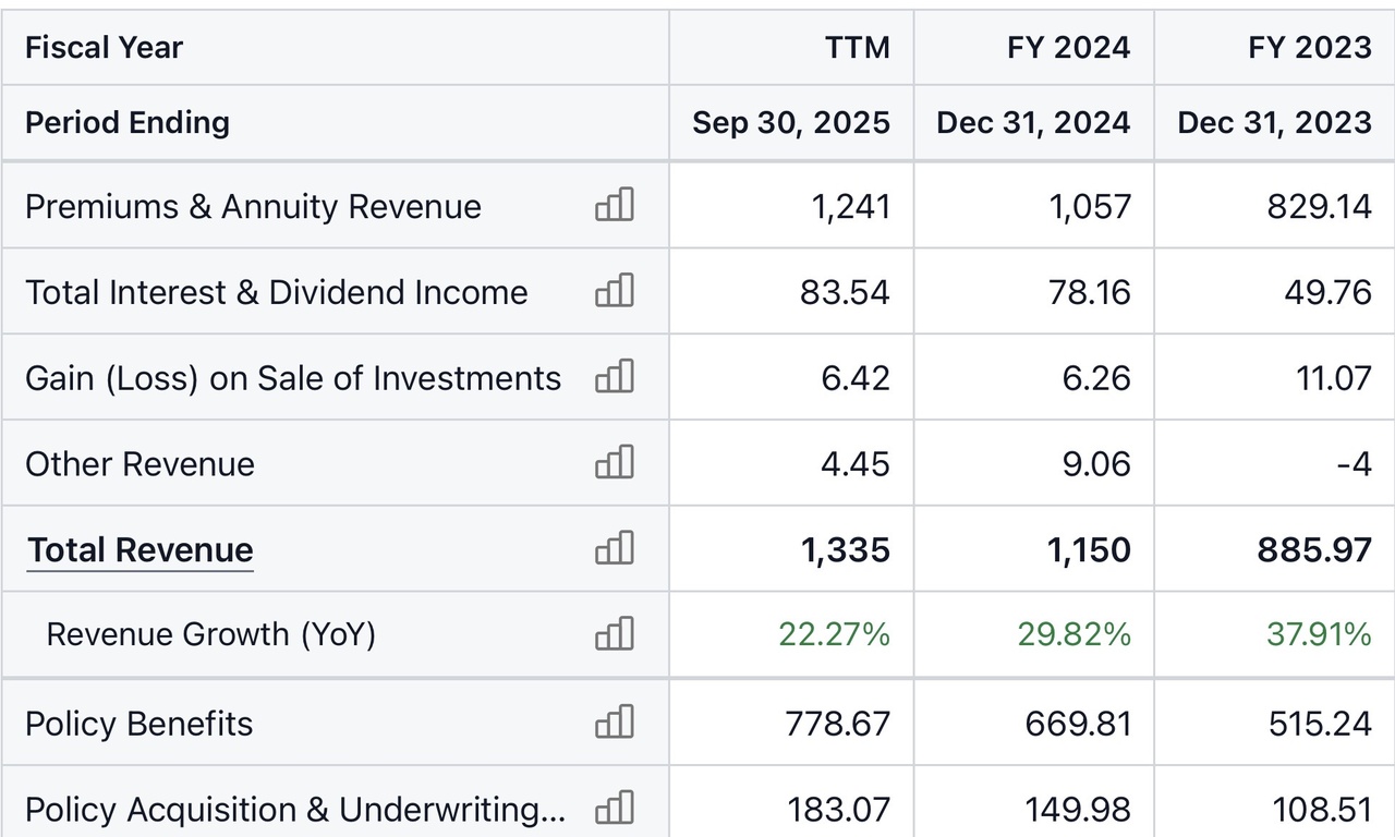- Growth: Gross sales (written premiums) recently rose by over 50 % year-on-year (Q3 2025).