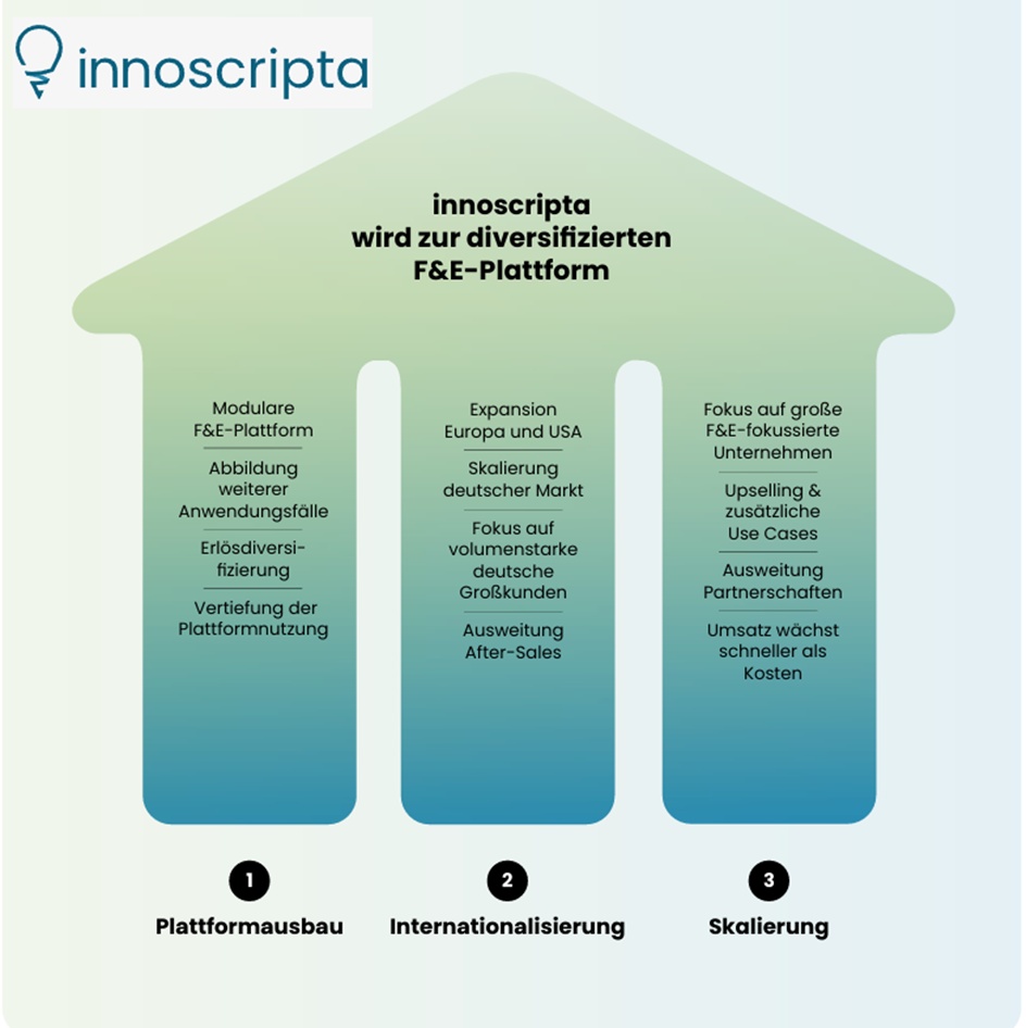 In the coming years, innoscripta will develop from a primarily funding-driven platform into a diversified software platform that increases the efficiency, transparency and controllability of R&D activities as a whole. Fiscal research funding will remain an important, but not the only, component of the platform. In the long term, Clusterix is to be established internationally as a central system for R&D-related processes. The innoscripta growth strategy has three strong drivers: platform expansion, growth in core markets such as Germany and increasingly internationally, and scaling the business model.